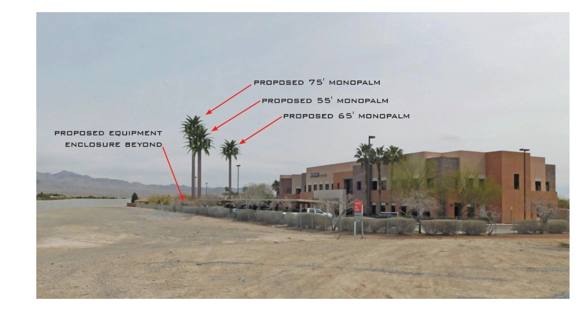 The multiple monopalm facility will consist of a 75’, 65’ and 55’ monopalm, located at the I-215 N & N. Aliante Pkwy interchange, south of the Aliante Hotel & Casino. The site will provide coverage to residential homes in the Aliante master planned community,commercial center, Aliante Library & Nature Discovery Park.